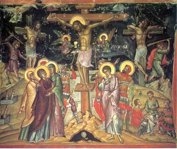 Hristos e pe cruce, gol: pe cap, o cunună de spini, piroane, străpungându-I gleznele şi încheieturile mâinilor, Îl ţintuiesc pe lemn, trupul e plin de sânge şi vânătăi, secretează numai sudoare şi geamătul surd al cărnii robite.