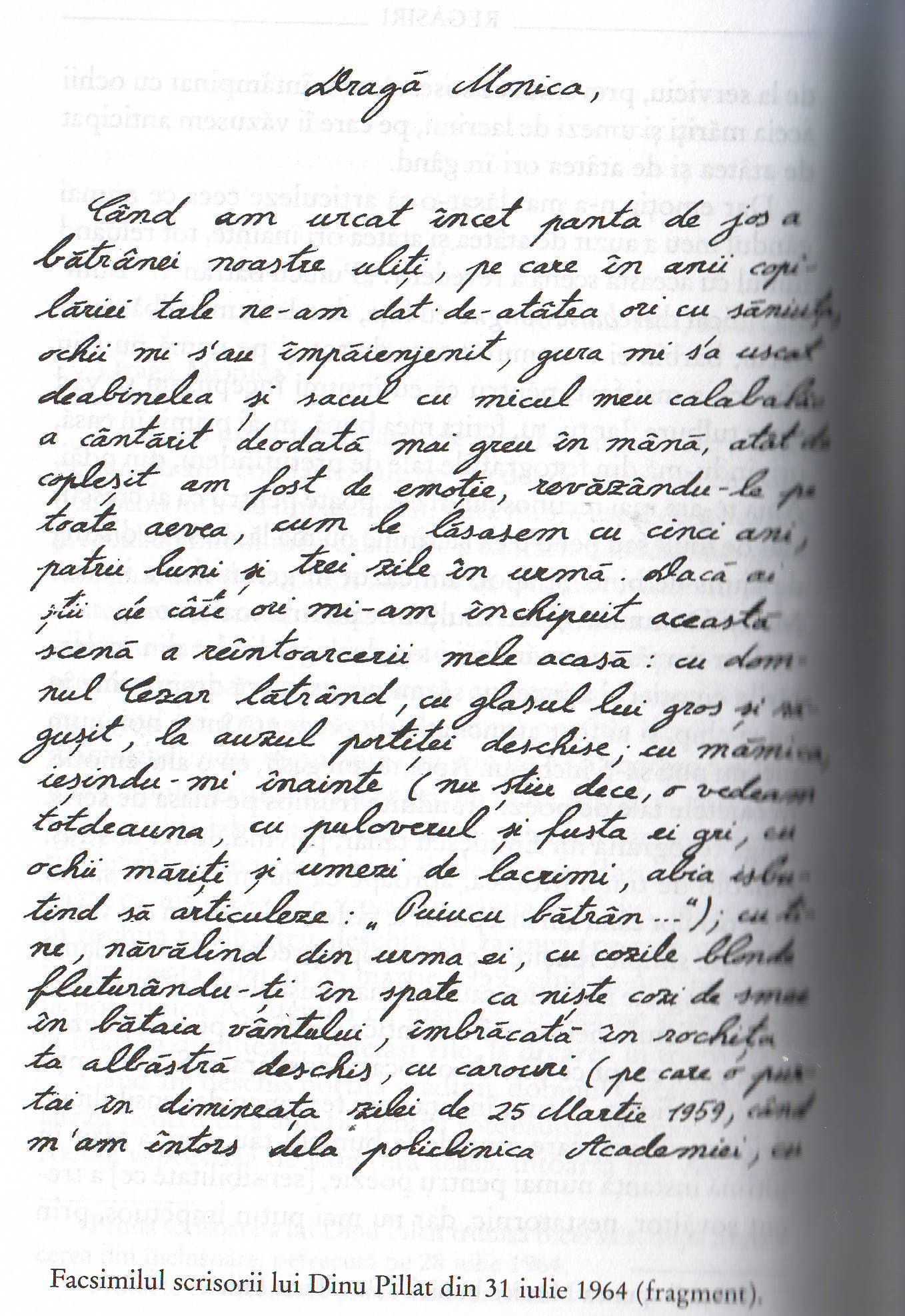 Intr-un tarziu, mamicai i s-a dezlegat limba din inclestarile emotiei si a inceput sa-mi povesteasca despre tine in fel si chip, si at fost atunci atat de prezenta intre noi, cum nici nu poti sa-ti inchipui. Apoi te-am gasit, cu o alta emotie, in caietele tale de poezii, randuite frumos pe masa de scris, langa fotografia lui Eminescu tanar, privind, lunar abstras, dincolo de timp. Monica, aproape ca nu mi-a venit sa-mi cred ochilor cand am inceput sa le rasfoiesc! Nu mai era vorba de niste simple reusite ale unui copil precoce, care exclama cu o stangacie mai mica sau mai mare niste lucruri in versuri, ci de indiciul unei vocatii autentice si adanci pentru poezie, ceva grav ca tot ce tine de o vocatie adevarata. Si am simtit atunci, infiorat, ca sunt in fata unui fenomen de sensibilitate lirica ereditara, care vine de la bunicul tau, care a trait in ultima instanta numai pentru poezie, [sensibilitate ce] a trecut sovaitor, nestatornic, dar nu mai putin impetuos, prin tanti Pia, care are si ea admirabile aptitudini lirice, si se manifesta acum atat de emotionant promitator in tine. La inceputul drumului, in marea aventura a poeziei pe care adolescenta a facut primii pasi inefabili, eu iti urez fierbinte: „Drum bun si toate panzele sus!”
