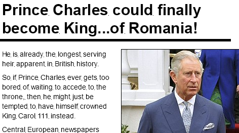 Ziarele au mers şi mai departe, speculând că Charles ar putea renunţa la tronul Marii Britanii în favoarea fiului său cel mare, William, şi să devină următorul rege al României. Ele susţin că ideea are o asemenea bază încât acesta este motivul pentru care preşedintele Traian Băsescu a lansat o serie de atacuri la adresa regelui Mihai şi a monarhiei în general.