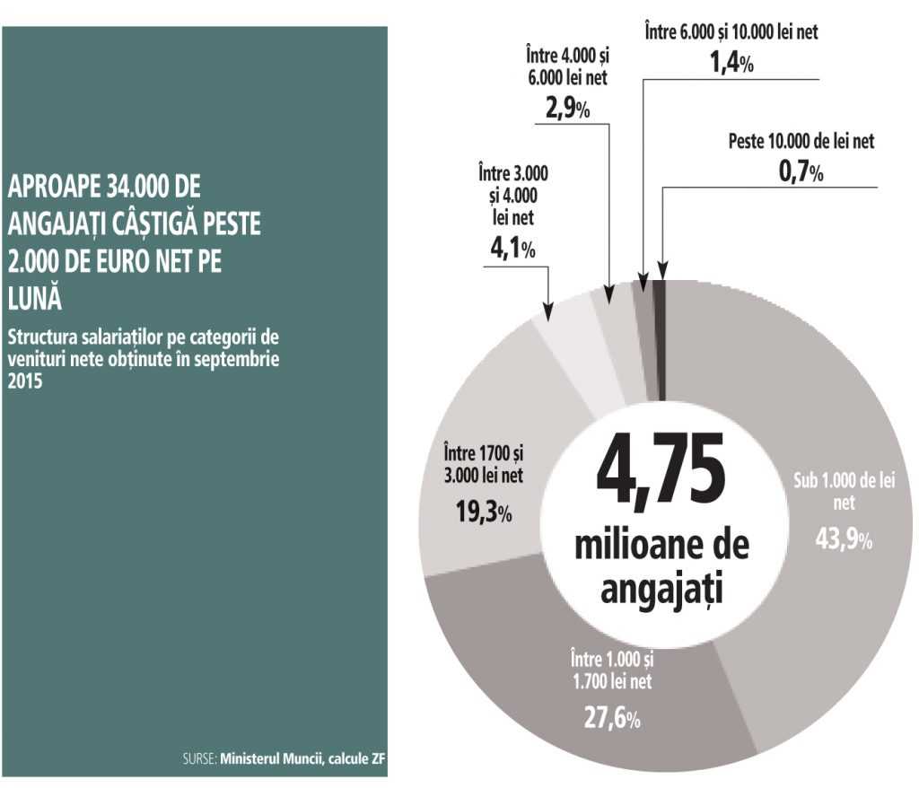 Structura salariaţilor pe categorii de venituri ilustrează o discrepanţă majoră pe piaţa muncii din România, în care foarte mulţi salariaţi câştigă foarte puţin şi foarte puţini salariaţi au venituri mari. Astfel, circa 44% dintre angajaţii români au venituri de sub 1.000 de lei net pe lună (adică peste 2 milioane de salariaţi), iar 28% câştigă între 1.000 şi 1.700 de lei net pe lună (adică peste 1,3 milioane de persoane). Totodată, aproape un sfert (23% dintre angajaţi, adică 1,1 milioane de persoane) câştigă între 1.700 şi 4.000 de lei net pe lună, în timp ce 5% dintre salariaţii români (adică circa 250.000 de oameni) câştigă peste 4.000 de lei net pe lună. […]/ integral pe zf.ro
