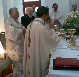 – N.C.: M-am impartasit intr-adevar singur. Nu am am primit nici de la nuntiul papal impartasania, nici de la ceilalti. Am luat singur prima data bucatica de prescura, care reprezenta Trupul Mantuitorului si apoi potirul in care era Sangele Mantuitorului. Practic vorbind, m-am impartasit singur, dar evident m-am impartasit din impartasania, din cuminecatura oficiata de clerul greco-catolic. Dar repet, din punct de vedere liturgic, intre noi si greco-catolici nu exista deosebire.