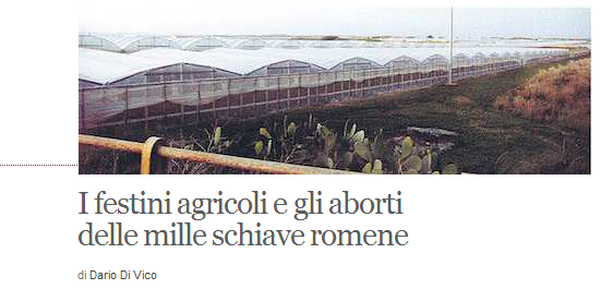 În Vittoria, o comună siciliană cu 60.000 de locuitori, în fiecare săptămână au loc şase avorturi. Rata este una uriaşă, raportată la numărul locuitorilor, iar primarul localităţii a cerut lămuriri Ministerului Sănătăţii, transmite cotidianul italian „Corriere della Sera”. Fenomenul ar fi cauzat de avansul semnificativ înregistrat în ultimii ani de agricultorii din zonă, care şi-au angajat muncitoare din România pe care le folosesc şi ca sclave sexuale.