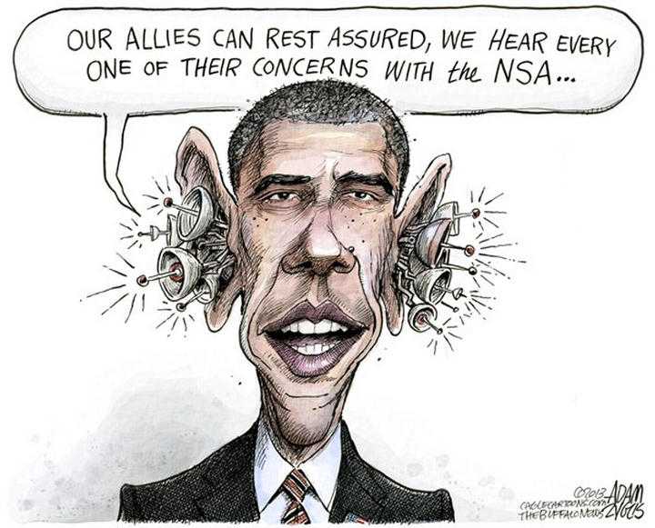Obama a luat apararea acestor infractiuni si a celor care le supravegheaza. Si-a inceput discursul prin compararea eforturilor revolutionarilor americani de a urmari miscarile de trupe britanice cu Fratele Cel Mare NSA care spioneaza poporul american astazi. A uitat insa sa mentioneze ca una dintre nemultumirile principale ale colonistilor americani fata de tirania britanica era emiterea de mandate generale de catre Coroana, care permiteau trupelor ocupante sa intre cu forta in casele oamenilor si sa le confiste hartiile personale.