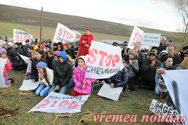 Peste 200 de persoane protestează, sâmbătă, la Siliştea (Vaslui), în perimetrul unde compania Chevron ar urma să amplaseze prima sondă de explorare a gazelor de şist, manifestanţii purtând bannere cu mesaje precum “Pungeşti-Băceşti-Găgeşti pe aici nu se trece” sau “Nu exploatării gazelor de şist”.