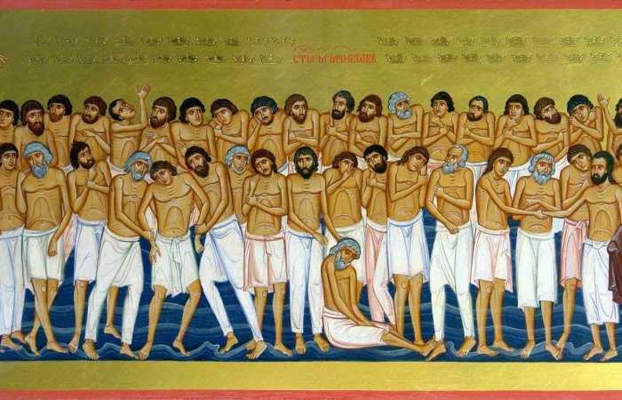 În apele îngheţate ale unui lac din Sevasta Armeniei se nevoiau muceniceşte patruzeci de bărbaţi, foşti soldaţi în armata crudului împărat Licinius unul dintre cei mai mari prigonitori ai creştinilor. După ce au fost supuşi la grele chinuri pe care aceştia le-au primit cu bucurie, văzând că nu vor să-şi lepede credinţa în Hristos guvernatorul oraşului a poruncit să fie mânaţi ca nişte vite în lac şi să moară acolo de frig.